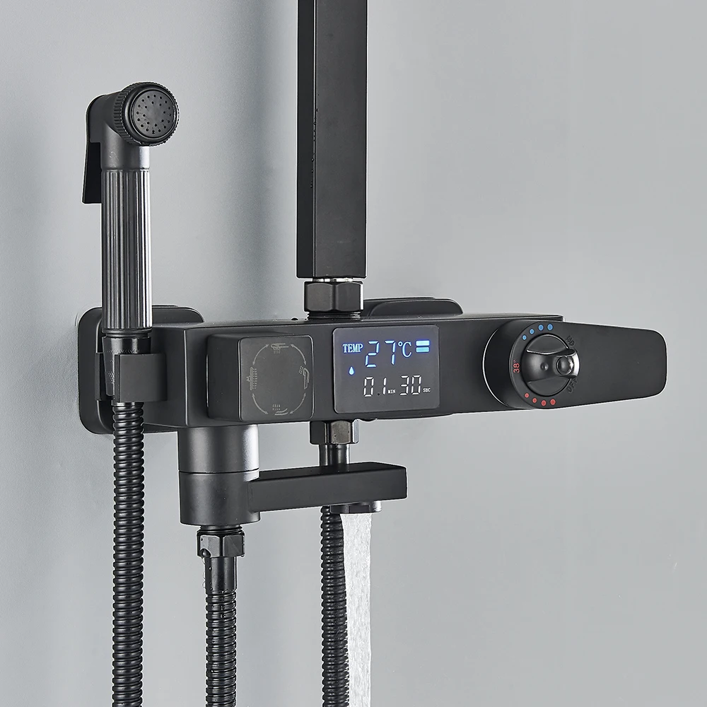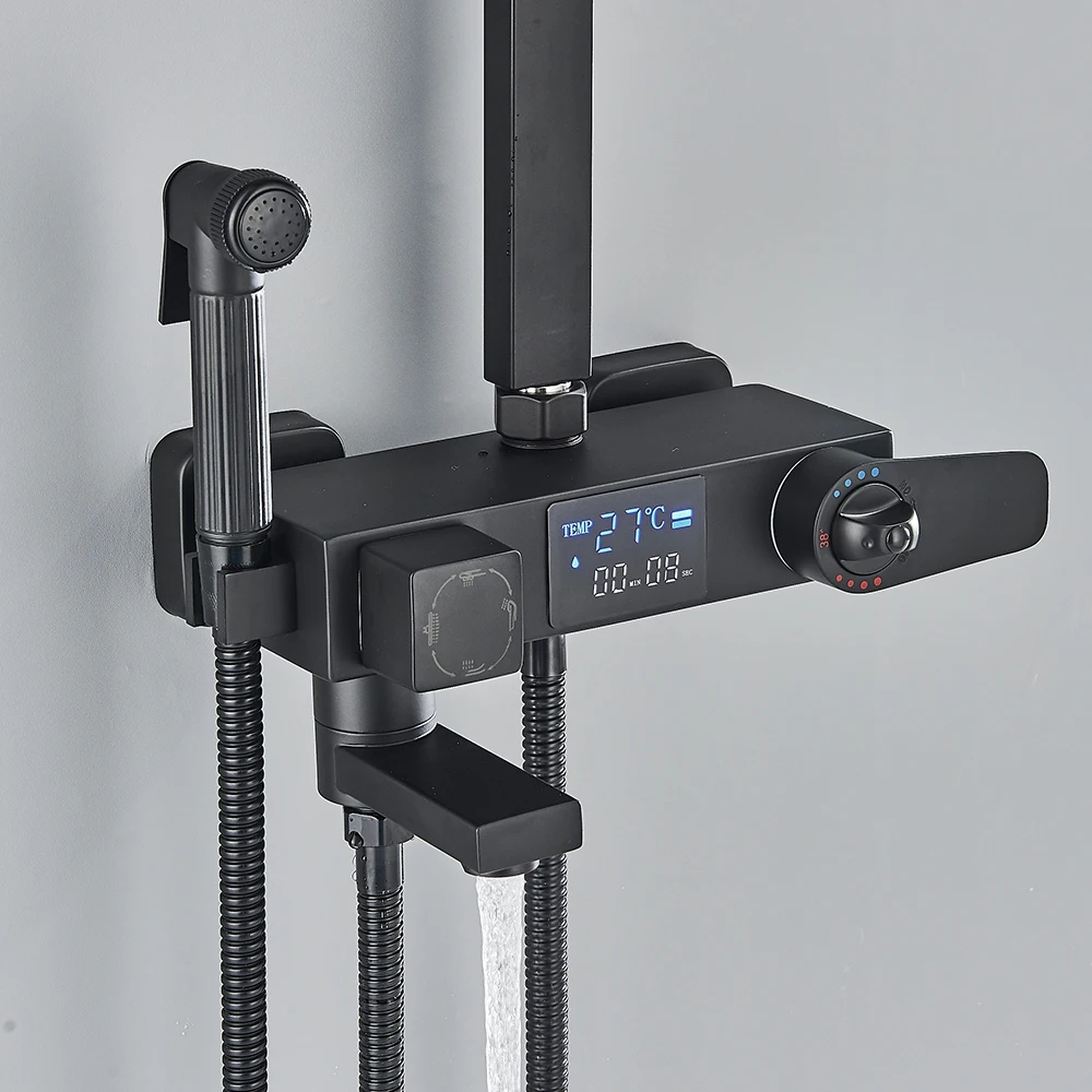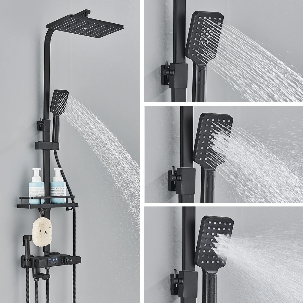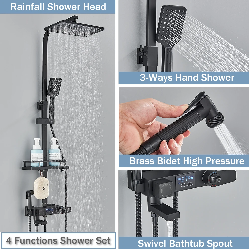 Black Digital Display Thermostatic Shower Faucet Bathroom Thermostatic 4 ways Rainfall Shower Mixer Tap,Shelf and Bidet Faucets