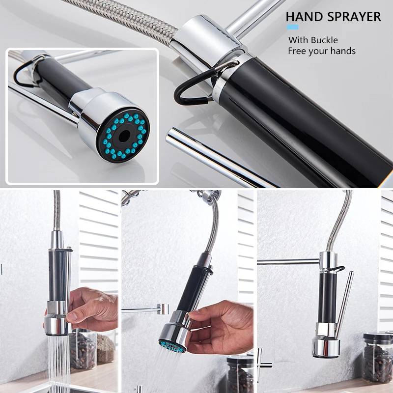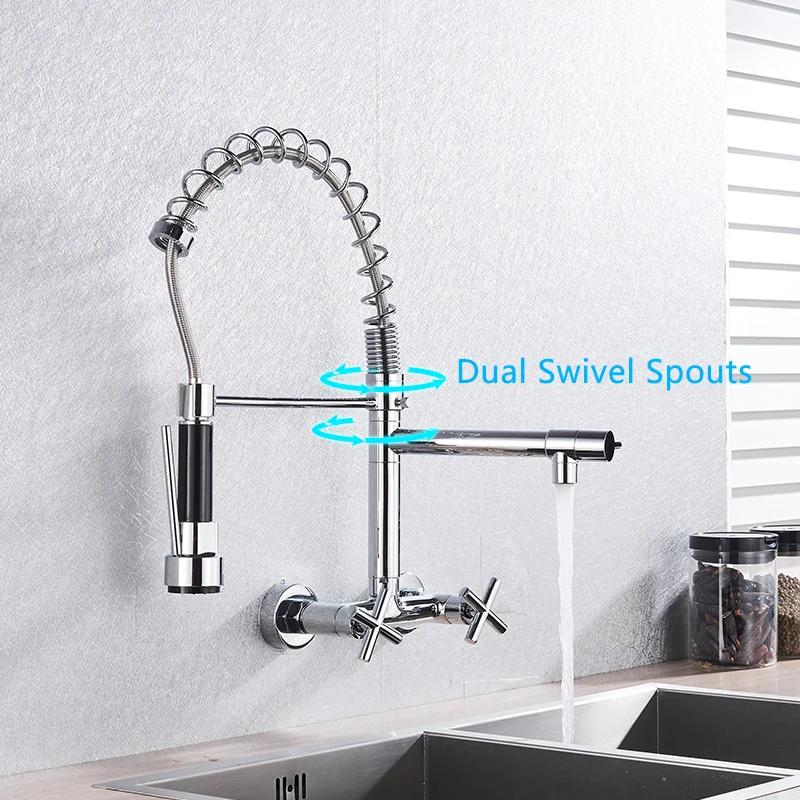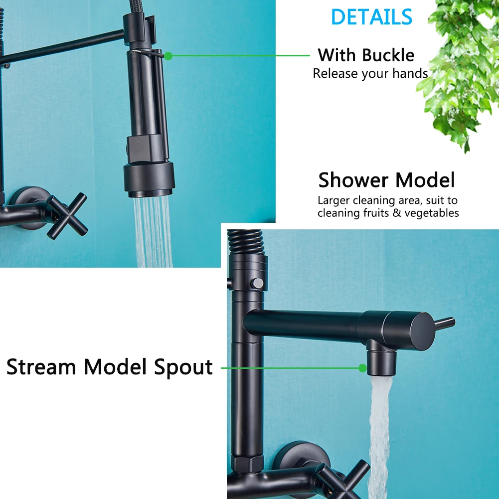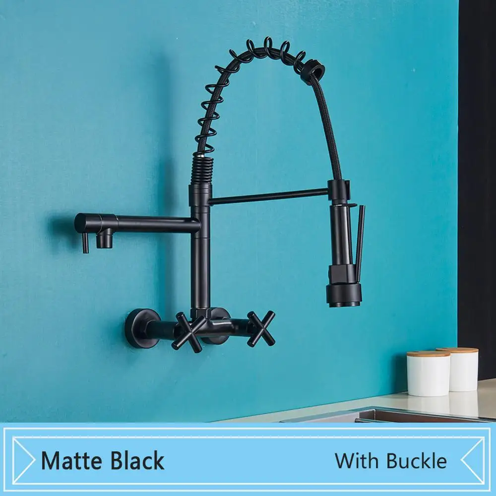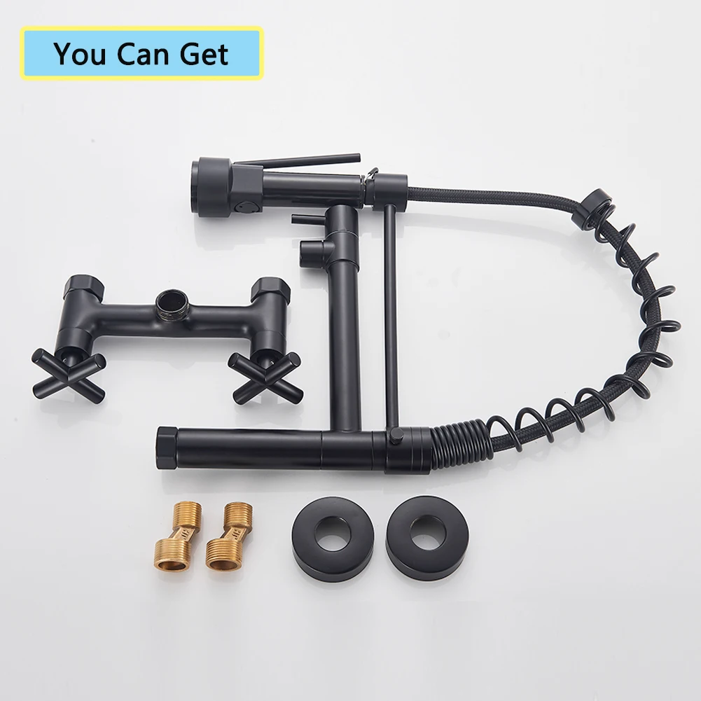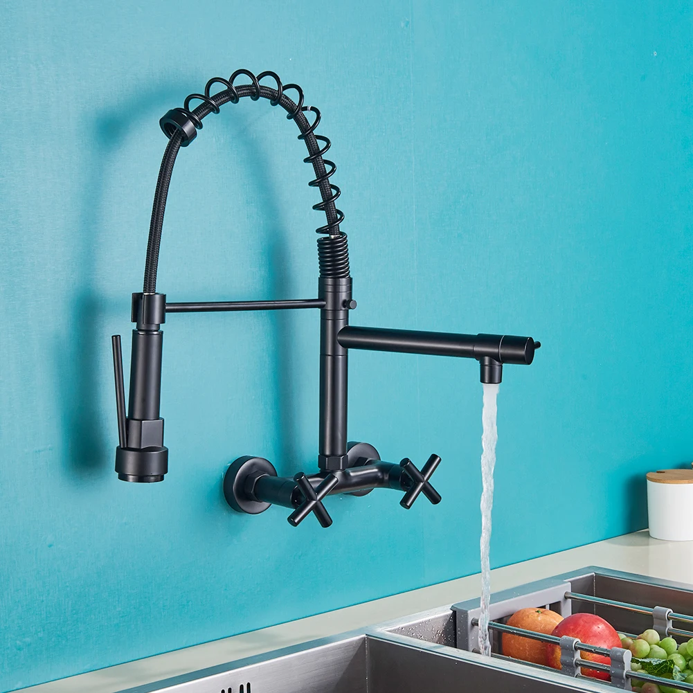 Rozin Black Kitchen Faucet Dual Handles Hot Cold Water Kitchen Mixer Tap Wall Mounted Dual Swivel Spout Spring Pull Down Faucets